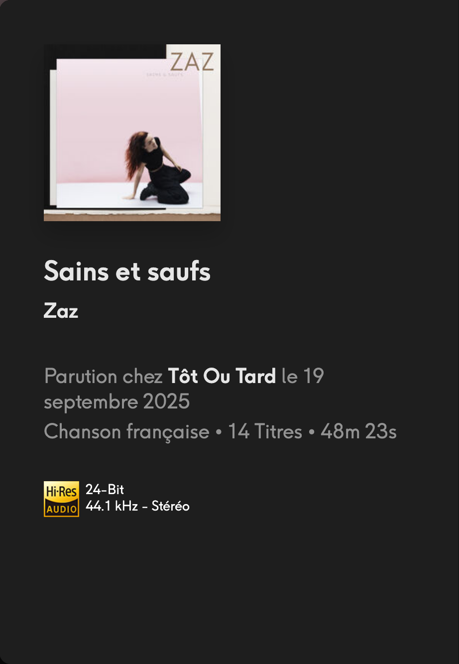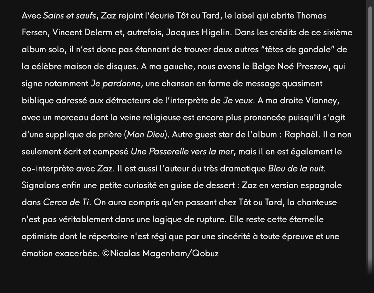 Avec Sains et saufs, Zaz rejoint l’écurie Tôt ou Tard, le label qui abrite Thomas Fersen, Vincent Delerm et, autrefois, Jacques Higelin. Dans les crédits de ce sixième album solo, il n’est donc pas étonnant de trouver deux autres “têtes de gondole” de la célèbre maison de disques. A ma gauche, nous avons le Belge Noé Preszow, qui signe notamment Je pardonne, une chanson en forme de message quasiment biblique adressé aux détracteurs de l’interprète de Je veux. A ma droite Vianney, avec un morceau dont la veine religieuse est encore plus prononcée puisqu'il s'agit d’une supplique de prière (Mon Dieu). Autre guest star de l’album : Raphaël. Il a non seulement écrit et composé Une Passerelle vers la mer, mais il en est également le co-interprète avec Zaz. Il est aussi l’auteur du très dramatique Bleu de la nuit. Signalons enfin une petite curiosité en guise de dessert : Zaz en version espagnole dans Cerca de Ti. On aura compris qu’en passant chez Tôt ou Tard, la chanteuse n’est pas véritablement dans une logique de rupture. Elle reste cette éternelle optimiste dont le répertoire n'est régi que par une sincérité à toute épreuve et une émotion exacerbée. ©Nicolas Magenham/Qobuz